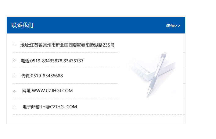 傳真:0519-83435688    郵編:213135    網址:WWW.czjhgj_com.15jp.com    電子郵箱:JH@czjhgj_com.15jp.com